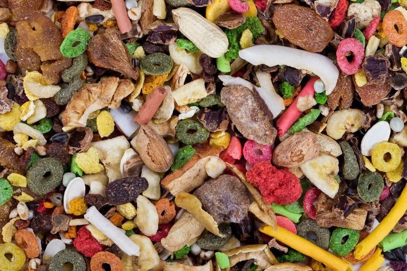 Skład: owoce suszone (morela, ananas, rodzynka, daktyle, banan, jabłka),orzechy ziemne, ekstrudy kukurydziane, groch, wyroby piekarnicze, chleb świętojański, dynia, słonecznik